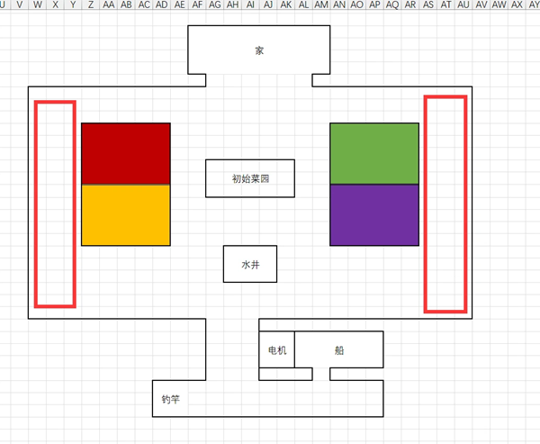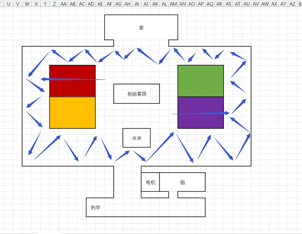 第二个原因是尽量将鹿哥牵制在初始菜园附近。如此夜晚绕农场外围行走时,无需过度担心鹿哥。中间菜园可不管,由鹿哥守护。鹿哥守右下角时可去左上角种植。